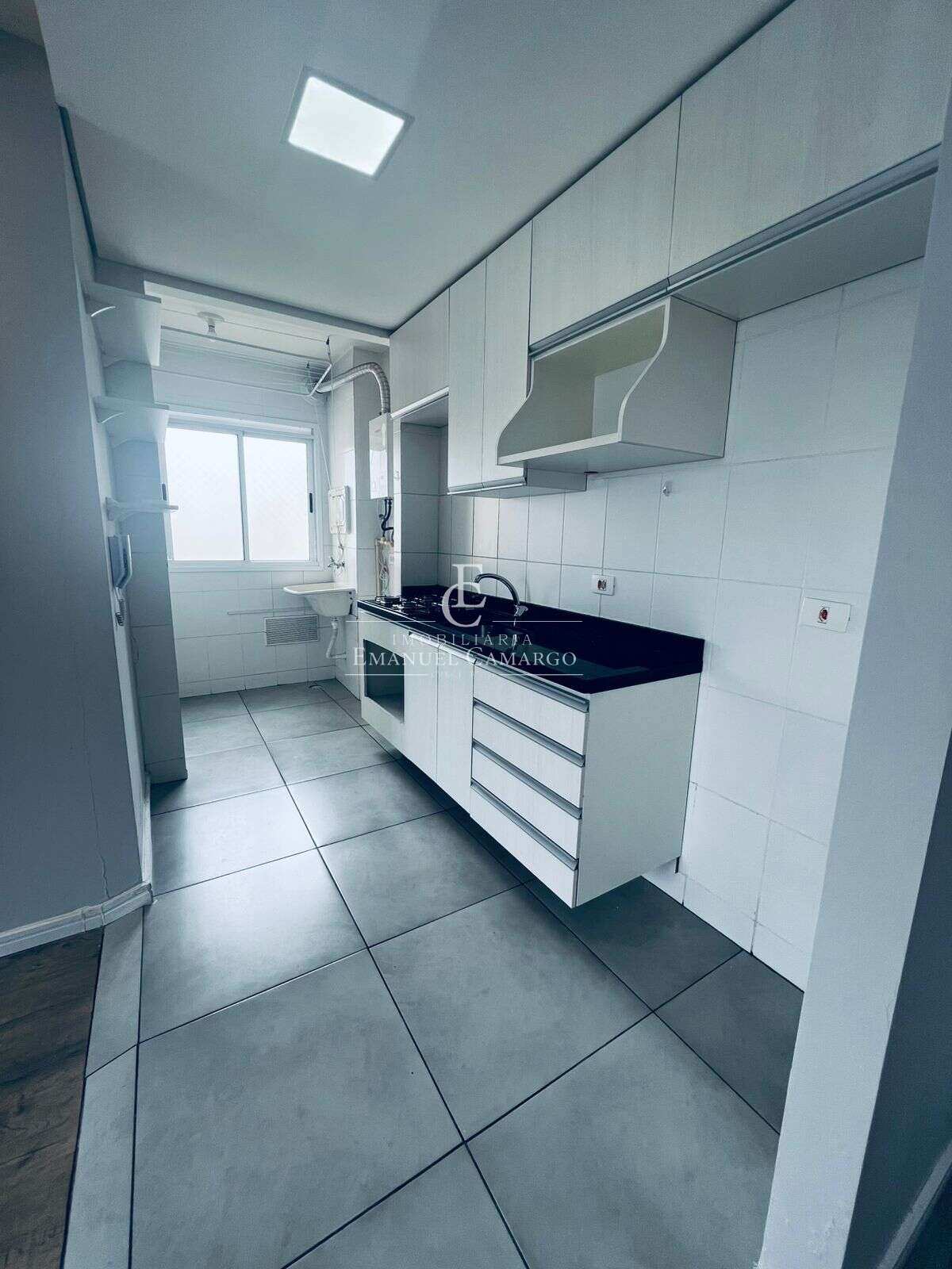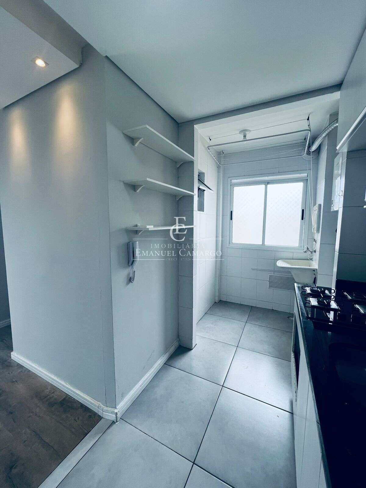 A cozinha é integrada, com móveis planejados e acesso direto à área de serviço — tudo prático e organizado. Banheiro social com armário e box em vidro.